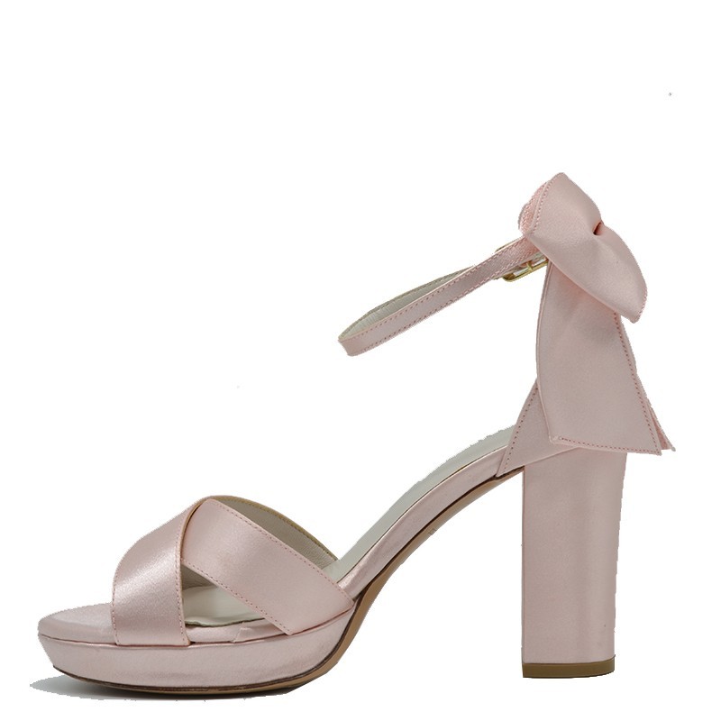 Bilero γυναικείο πέδιλο με ροζ σατεν μεταξωτό με φιόγκο με χοντρό τακούνι.
